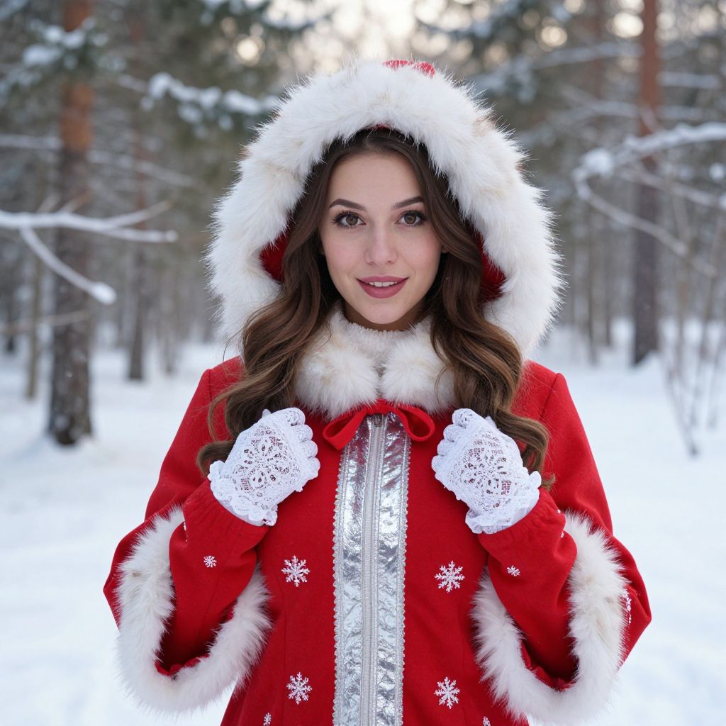 A young woman stands outdoors in a snowy forest wearing a festive red coat adorned with white fur trim and silver accents, complemented by delicate white lace gloves. Her warm and cheerful expression captures the cozy and magical atmosphere of winter holidays.