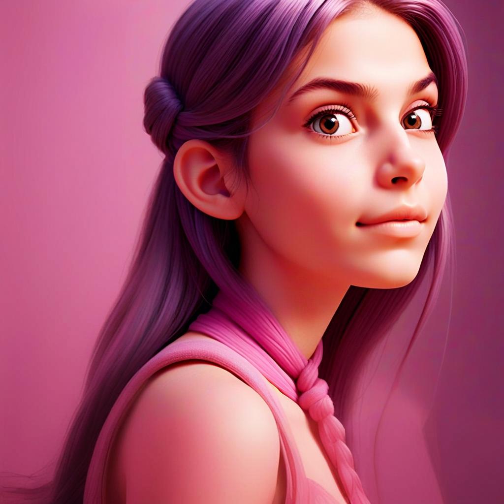 Anime Style Portrait of Young Woman with Purple Hair in Pink Background