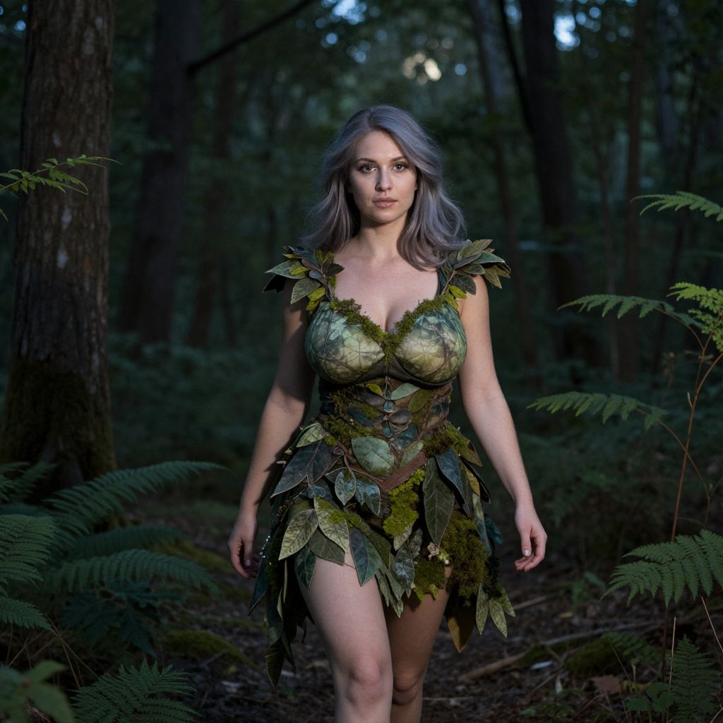 A woman with gray hair stands confidently in a forest setting, wearing an intricate dress made entirely of leaves and moss. The costume blends natural elements with a fantasy-inspired design, evoking the essence of a forest nymph or nature spirit.