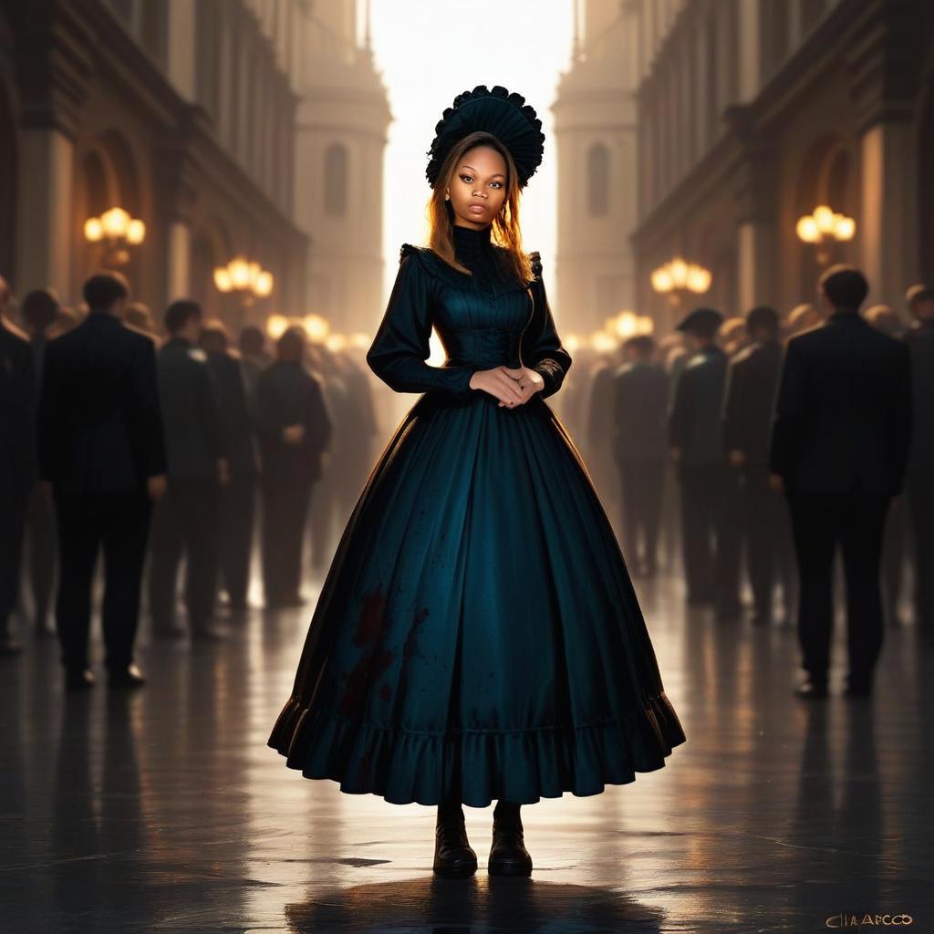 A poised woman stands confidently in an elegant, dark Victorian-style dress with a matching headpiece, set against a softly lit, grand architectural background filled with shadowed figures. The image combines classical elegance and contemporary mood with dramatic lighting that highlights the intricate texture of her gown and the solemn atmosphere around her.