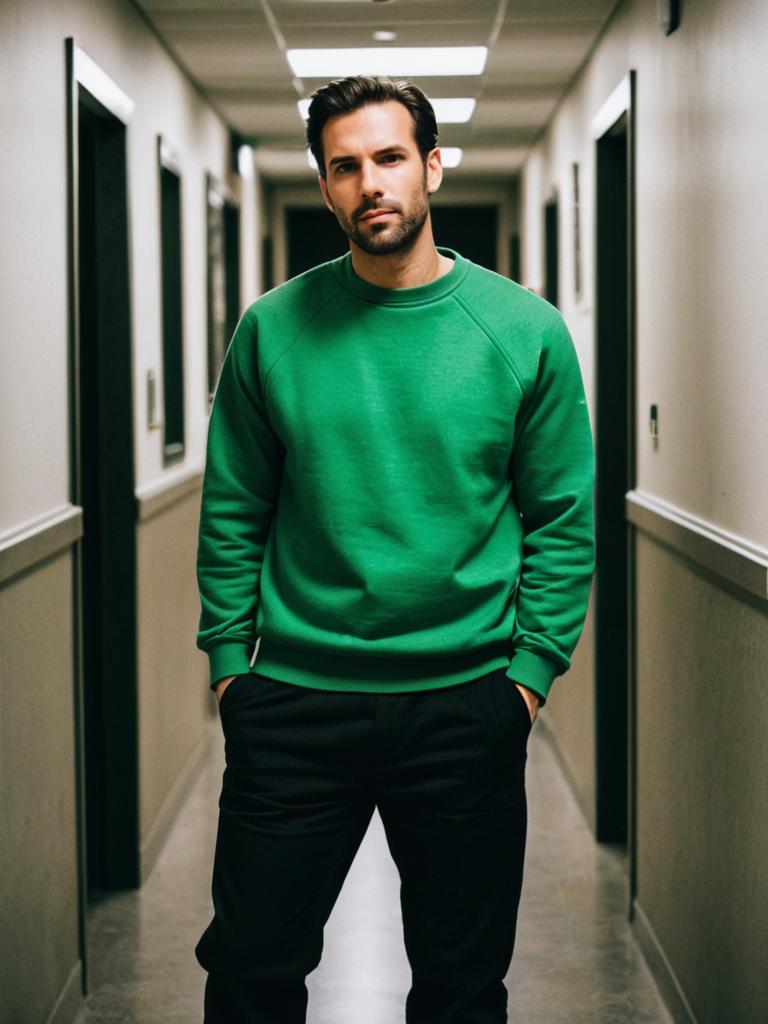 A man stands confidently in a narrow hallway wearing a bright green sweatshirt paired with black pants, showcasing a casual yet stylish look. The image captures a modern, relaxed fashion style with a focus on bold color contrast and simplicity.