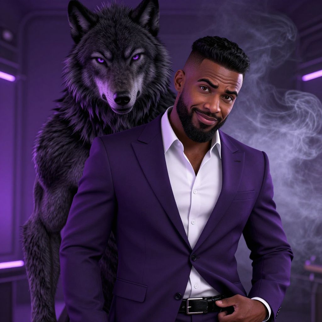 Confident Man in Purple Suit with Mystical Wolf and Purple Lighting