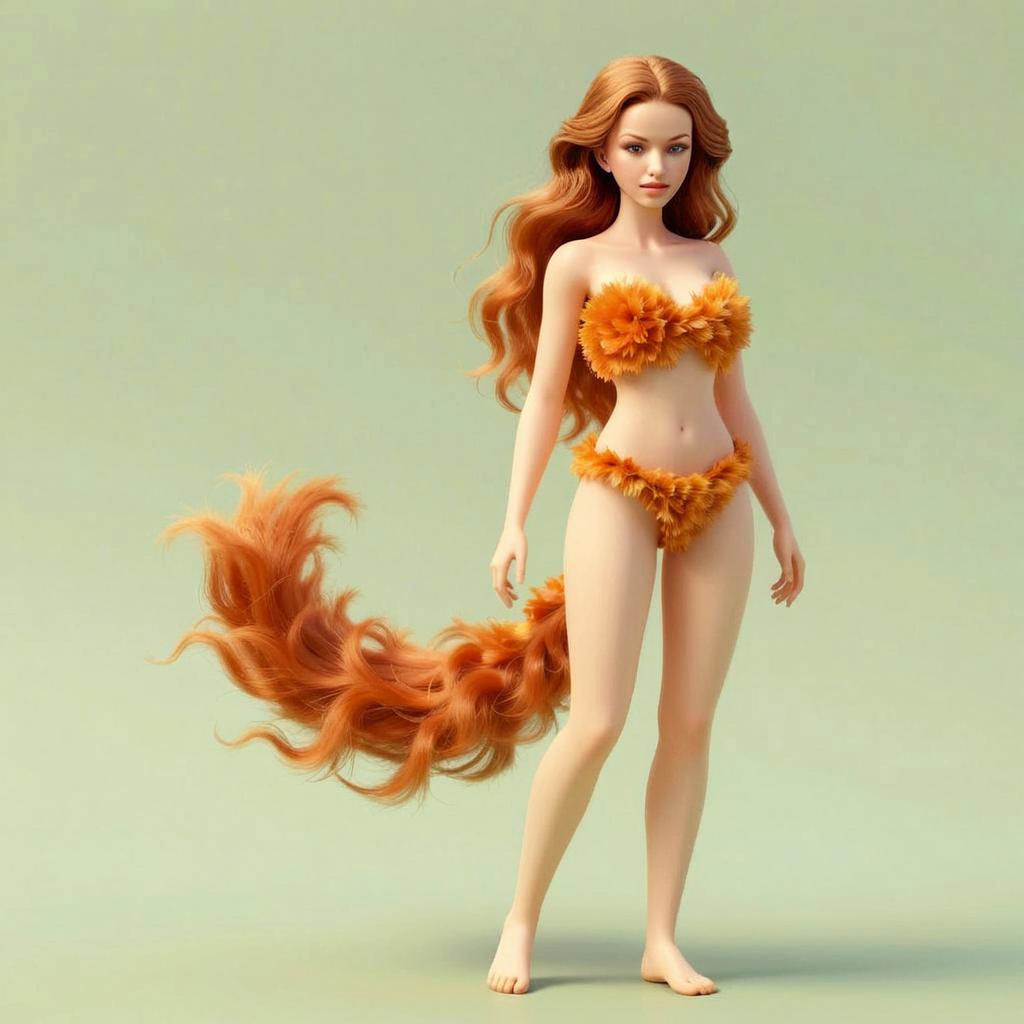 A realistic 3D rendered figurine of a woman with long, wavy red hair styled into a voluminous tail. She is dressed in a unique, furry orange bikini, set against a plain, muted green background, emphasizing the figure's vibrant colors and detailed textures.