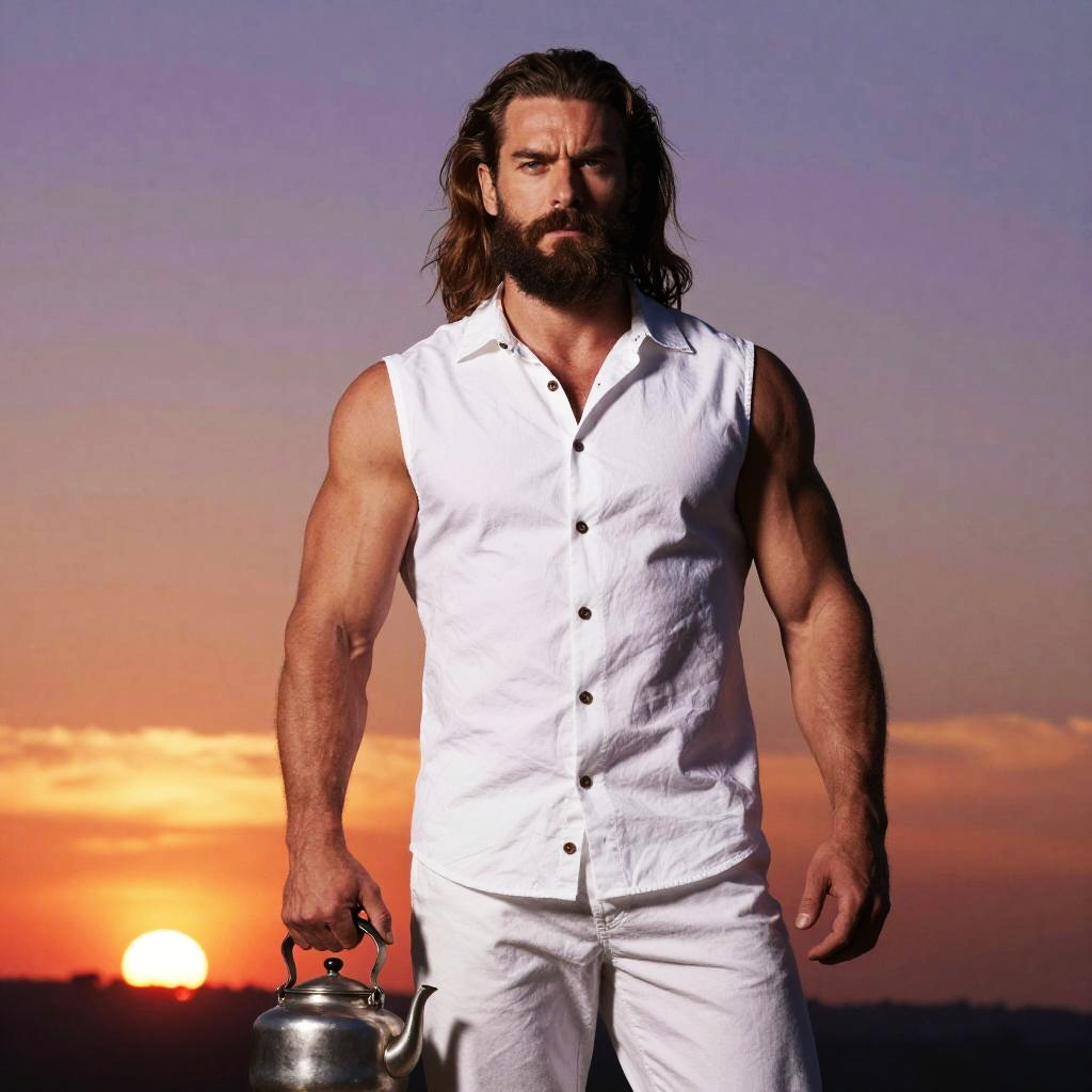 A muscular man with long hair and a beard stands confidently against a vibrant sunset backdrop. Dressed in an all-white sleeveless shirt and pants, he holds a metal kettle in his right hand, blending rugged masculinity with a serene outdoor setting.