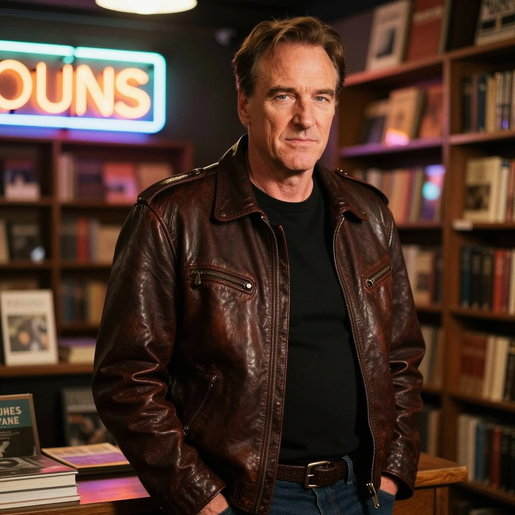 A confident man wearing a stylish brown leather jacket and black shirt stands in a cozy bookstore filled with shelves of books. The warm lighting and neon sign in the background add a modern yet vintage atmosphere to the portrait.