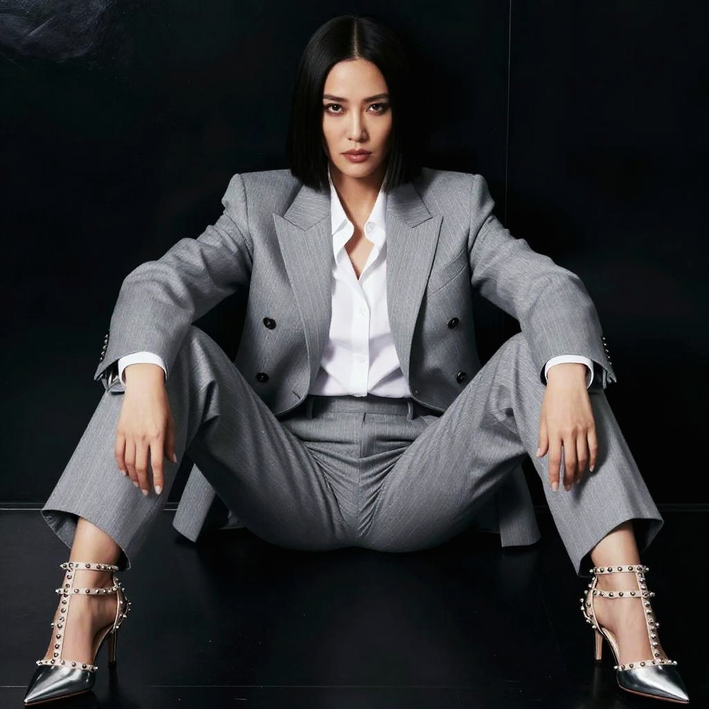 A confident woman dressed in a stylish gray pinstripe suit and white shirt poses seated on the floor against a dark backdrop. Her sleek bob haircut and intense gaze combined with metallic studded high heels highlight a modern, empowered aesthetic that blends professional attire with edgy fashion.