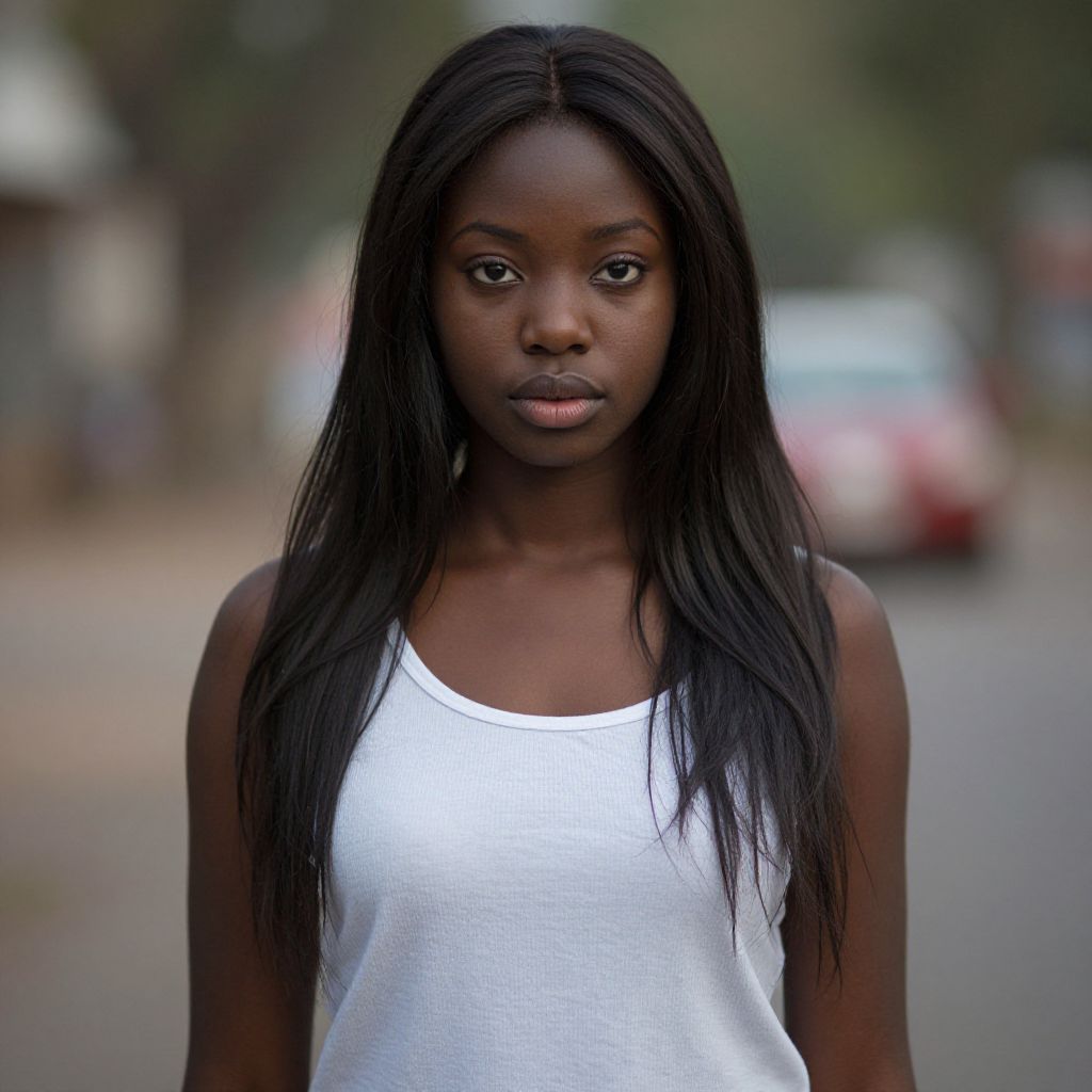 A close-up portrait of a young woman with long, straight black hair, wearing a white tank top. The image features a shallow depth of field, focusing sharply on her face with a softly blurred urban background.