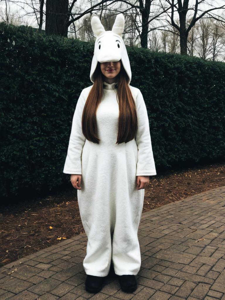 A woman wearing a full-body white costume inspired by Moomintroll stands outdoors on a paved path surrounded by trees and bushes. The whimsical outfit features a hood with large ears and expressive eyes, capturing the charming style of the beloved character from the Moomin series.