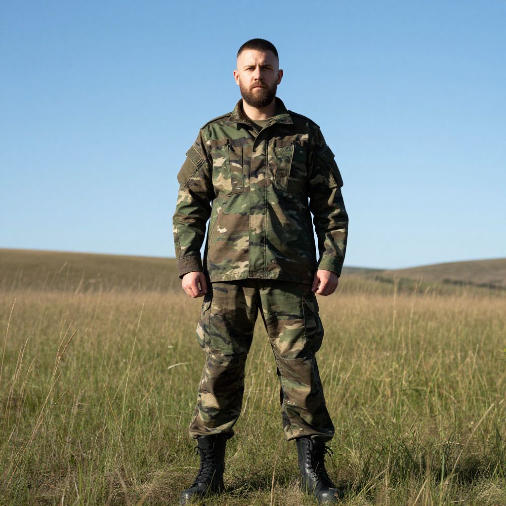 A man dressed in full camouflage military uniform stands confidently in a grassy open field under a clear blue sky. His serious expression and sturdy stance convey readiness and strength in a natural outdoor setting.