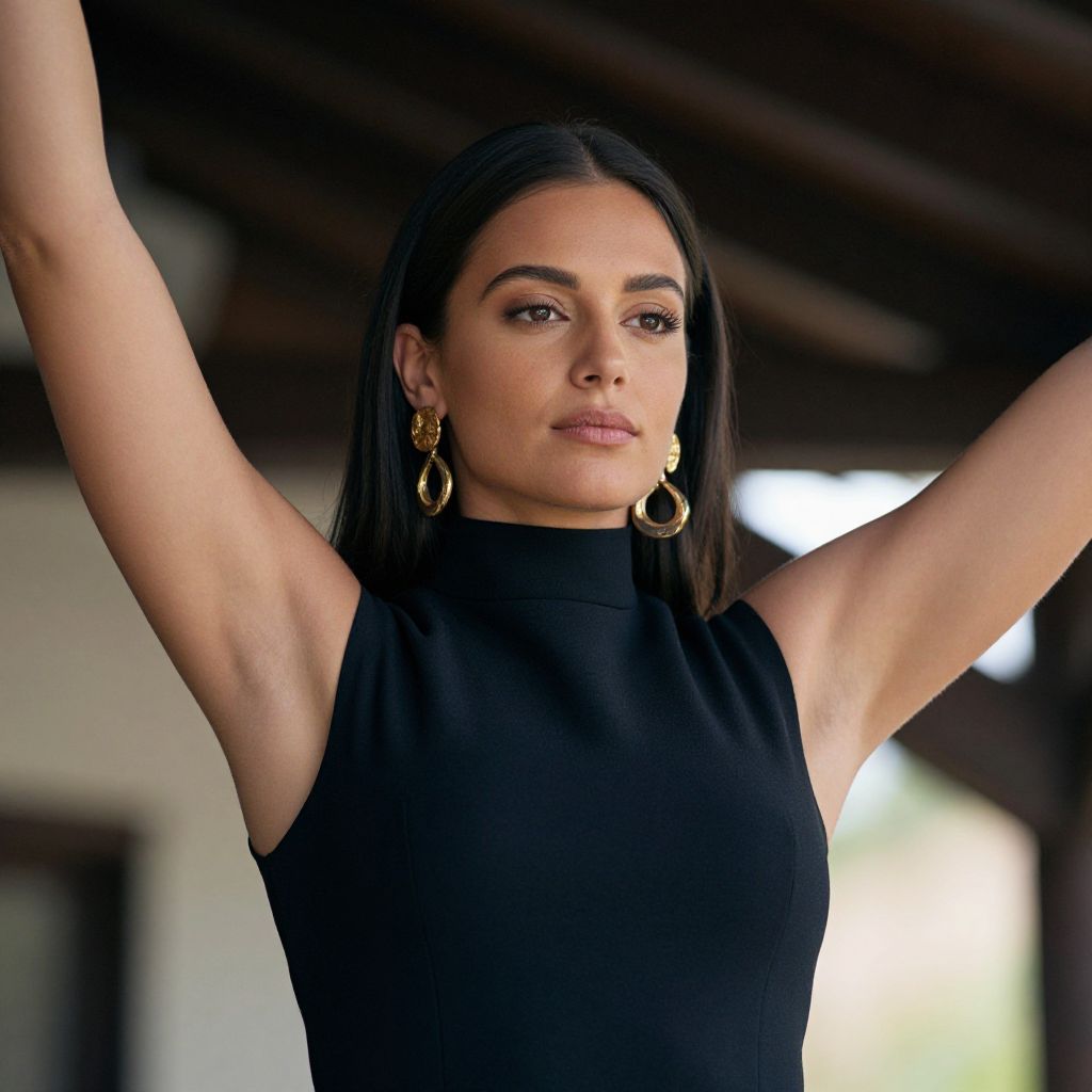 A confident woman with long dark hair raises her arms gracefully while wearing a sleeveless black top and striking gold earrings. The portrait captures her poised expression and elegant style against a softly blurred background.