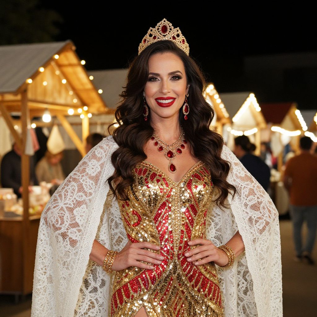 Woman in Gold and Red Sequined Gown with Jeweled Crown at Night Market