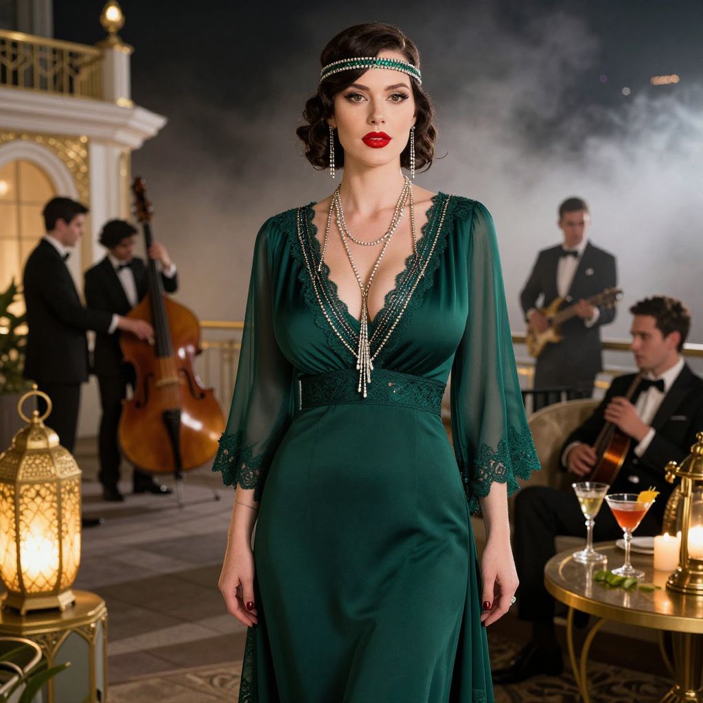 A sophisticated woman in a vintage emerald green dress and pearl accessories poses elegantly in a glamorous Art Deco style setting. Behind her, a jazz band plays softly, creating a timeless 1920s ambiance filled with opulence and charm.