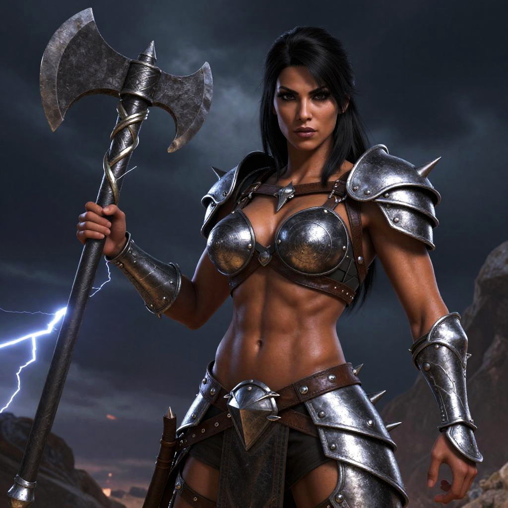 A fierce warrior woman stands ready for battle, clad in detailed, spiked metal armor that highlights her muscular physique. She grips a large double-headed battle axe with a twisted handle, set against a dramatic stormy sky with lightning illuminating the scene, embodying strength and determination in a fantasy setting.