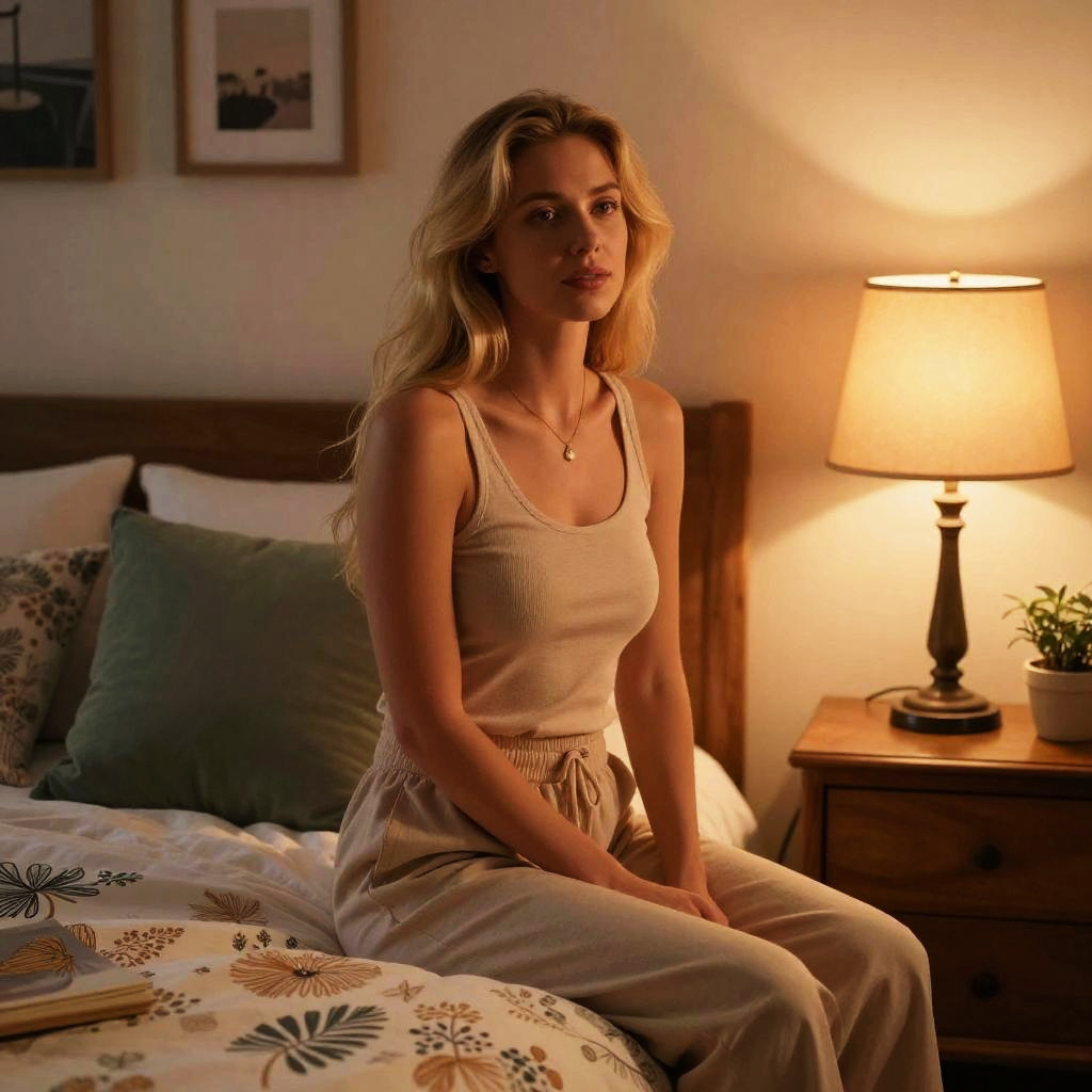 A young woman with long blonde hair sits thoughtfully on a bed in a warmly lit bedroom. The cozy setting includes floral bedding, a wooden nightstand with a lamp, and framed pictures on the wall, creating a calm and intimate atmosphere.