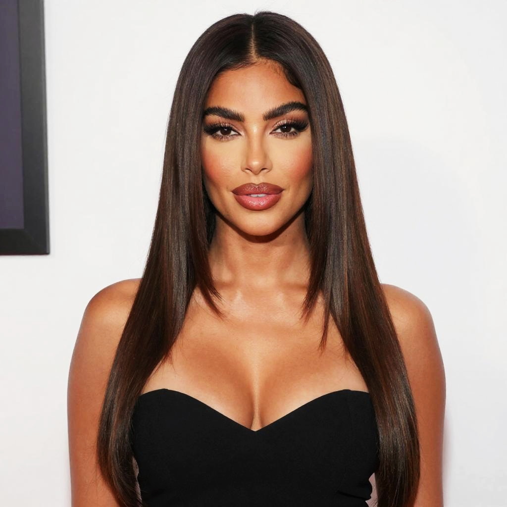 A confident woman with long, straight brunette hair poses against a plain white background, wearing a strapless black top. Her makeup emphasizes bold eyebrows, long lashes, and glossy lips, capturing a sleek and glamorous modern beauty style.