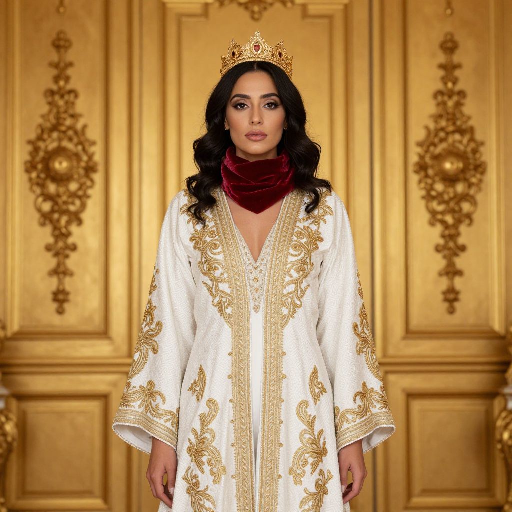 A regal woman stands confidently against an ornate golden backdrop, wearing a white robe richly embroidered with intricate gold patterns and a deep red velvet scarf around her neck. She is crowned with a gold crown, embodying elegance and royal sophistication in a luxurious, classical setting.