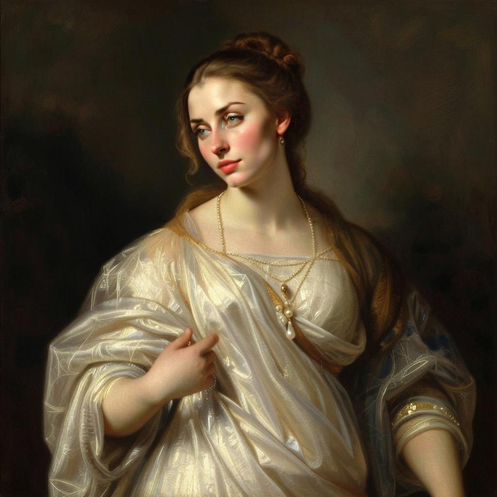 A refined young woman dressed in an elegant, shimmering cream-colored gown with intricate embroidery is portrayed in a classical style reminiscent of 19th-century portraiture. Her soft, contemplative expression and delicate pearl necklace add to the painting’s timeless and romantic atmosphere.