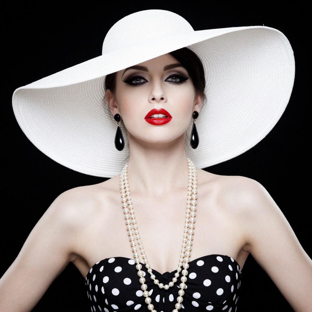 A glamorous woman poses confidently against a dark background, wearing a large white wide-brimmed hat and bold red lipstick. Her vintage-inspired look is completed with dramatic eye makeup, black teardrop earrings, a polka dot strapless dress, and layered pearl necklaces, evoking classic Hollywood elegance.