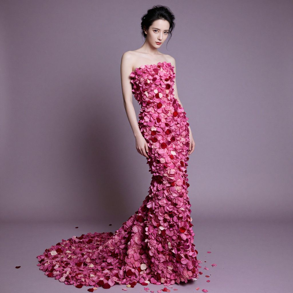 Elegant Woman Wearing Pink Flower Petal Gown with Long Train
