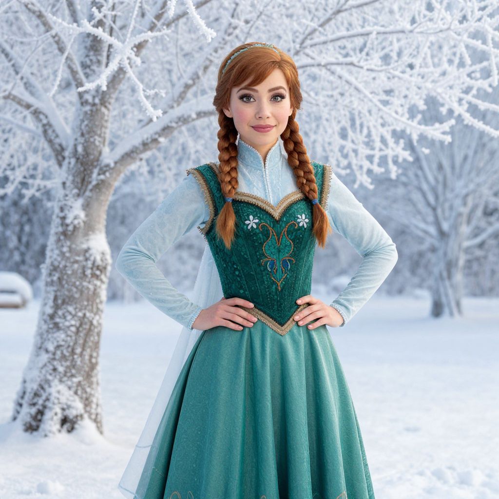 A woman dressed in a detailed, traditional-style costume reminiscent of a winter fairy tale stands confidently amidst a snowy landscape with frost-covered trees. Her outfit features intricate embroidery, a green bodice, and a flowing skirt, complemented by her braided red hair and serene expression.