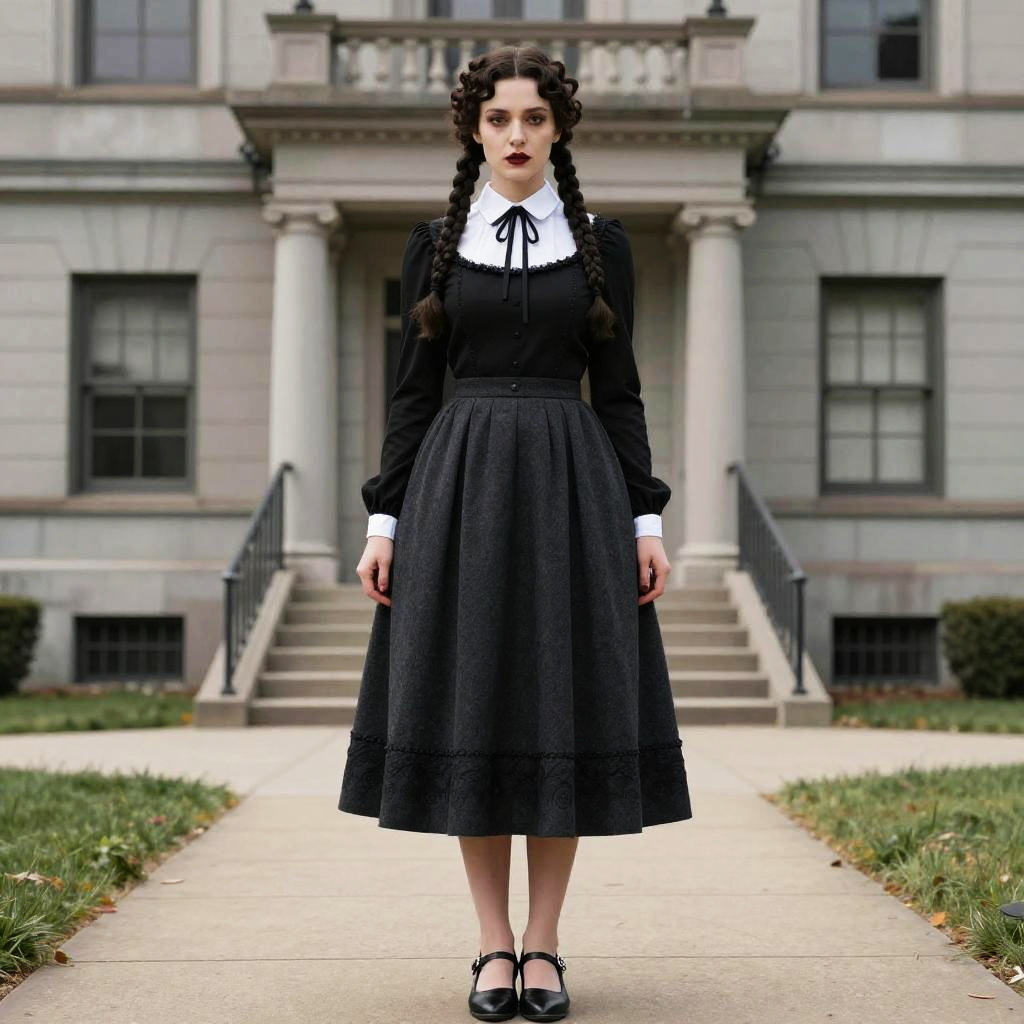 A woman dressed in a gothic-inspired, vintage-style black dress with a white collar and bow stands in front of a classical building. Her dark braided hair and deep makeup evoke a somber, retro aesthetic reminiscent of Wednesday Addams from popular culture.