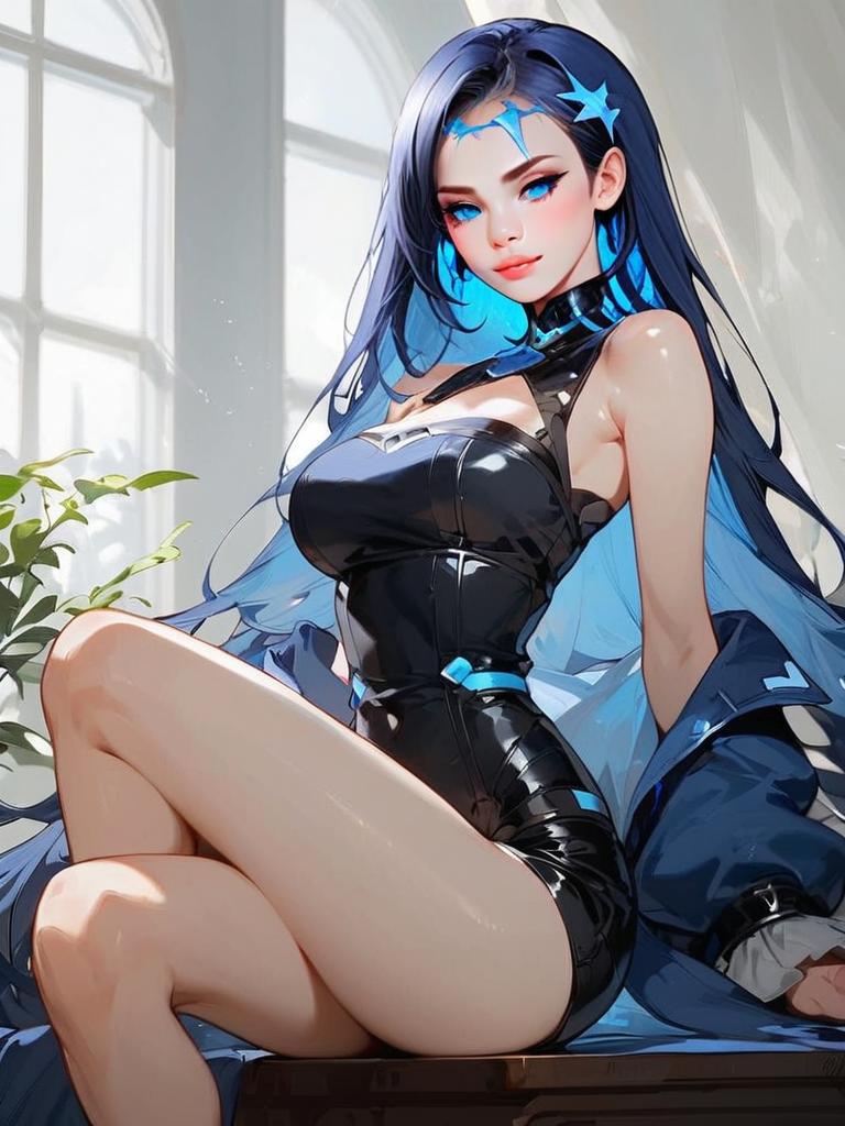 This digital anime-style artwork features a striking woman with long blue hair and bright blue eyes, wearing a glossy, black, form-fitting outfit that accentuates her figure. The highly detailed illustration captures a modern fantasy vibe with soft lighting filtering through a large window in the background, enhancing the vibrant colors and smooth textures of the character and surroundings.