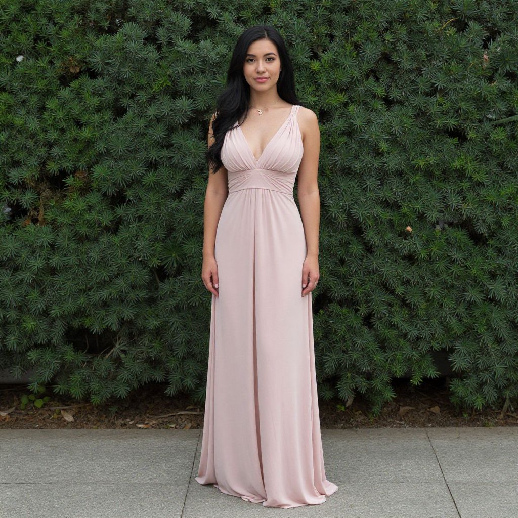 A woman stands gracefully against a lush green hedge, wearing a flowing pale pink evening gown with a deep V-neckline and gathered waist. The soft fabric and elegant silhouette create a sophisticated and timeless look, complemented by her long dark hair and minimal jewelry.