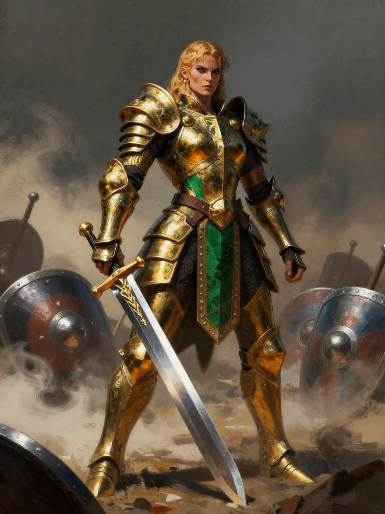 A confident woman warrior stands boldly in a battle scene, clad in ornate golden armor with green accents. She wields a large sword, surrounded by fallen shields and mist, embodying strength and resilience in a fantasy medieval setting.
