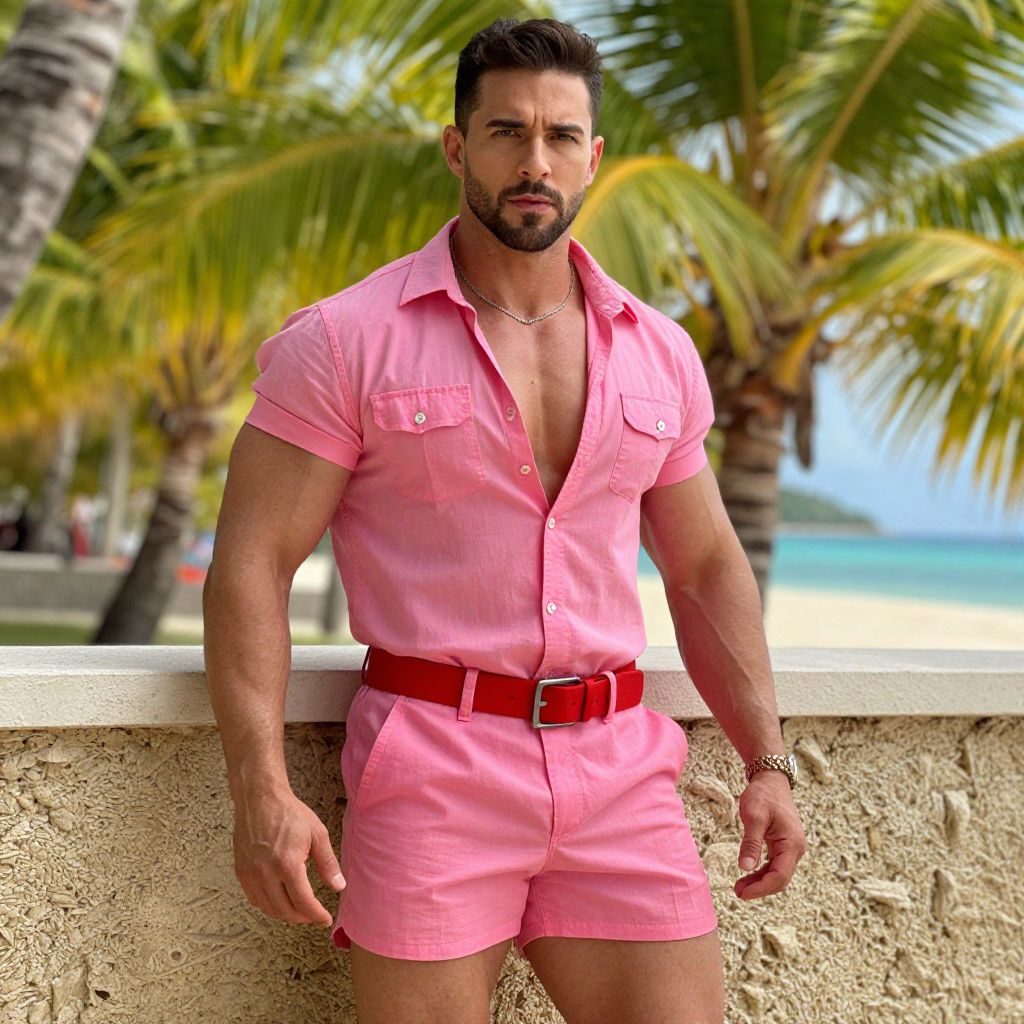 A muscular man stands confidently by a textured stone wall with palm trees and a beach visible in the background. He is dressed stylishly in a matching pink short-sleeve shirt and shorts, accessorized with a vibrant red belt and a silver chain necklace, evoking a relaxed tropical summer vibe.
