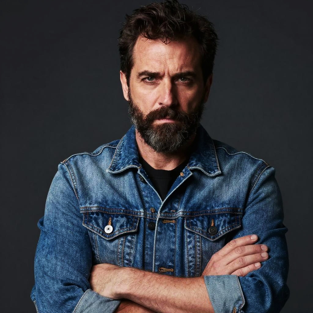 A serious man with a rugged beard and intense gaze poses confidently with his arms crossed, wearing a classic blue denim jacket against a dark background. The image captures a strong and contemplative mood, emphasizing masculinity and casual style.