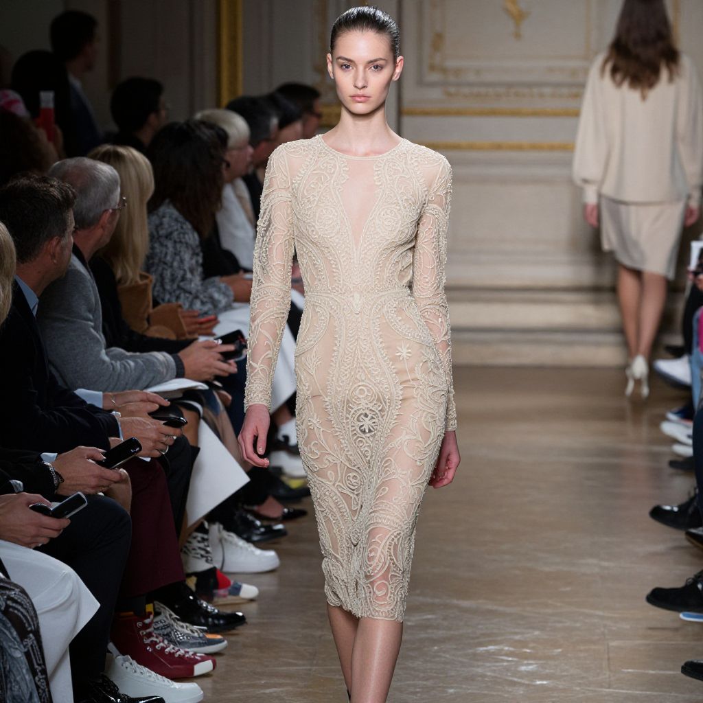 A woman walks the runway in a sheer, intricately embroidered nude dress featuring ornate patterns and a form-fitting silhouette, showcasing elegant high fashion at a sophisticated indoor runway show. The setting captures the attention of an attentive audience seated along the catwalk in a classic venue with ornate details.