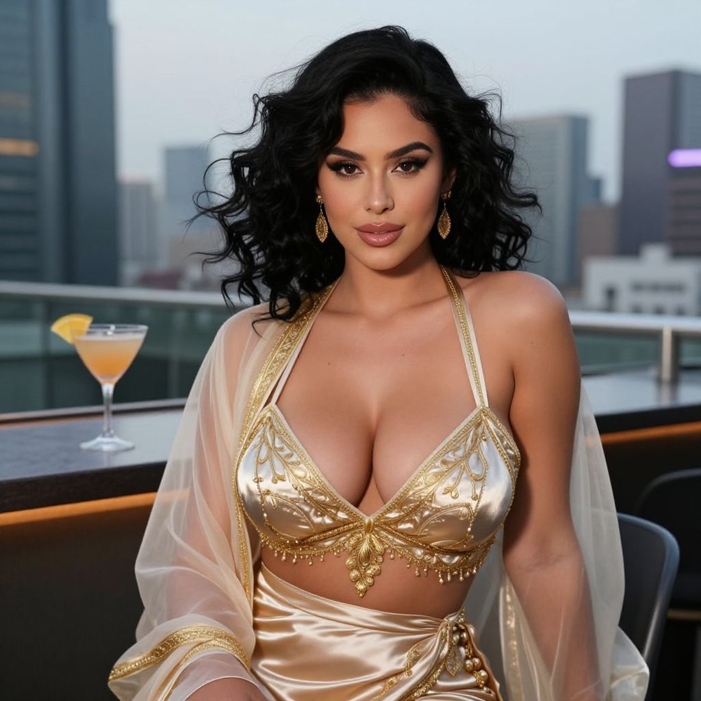 A glamorous woman poses on a rooftop bar with a city skyline in the background, wearing an elegant gold and cream satin ensemble featuring intricate embroidery and a sheer shawl. Her voluminous curly hair and statement earrings complement the sophisticated, luxurious vibe of the scene.