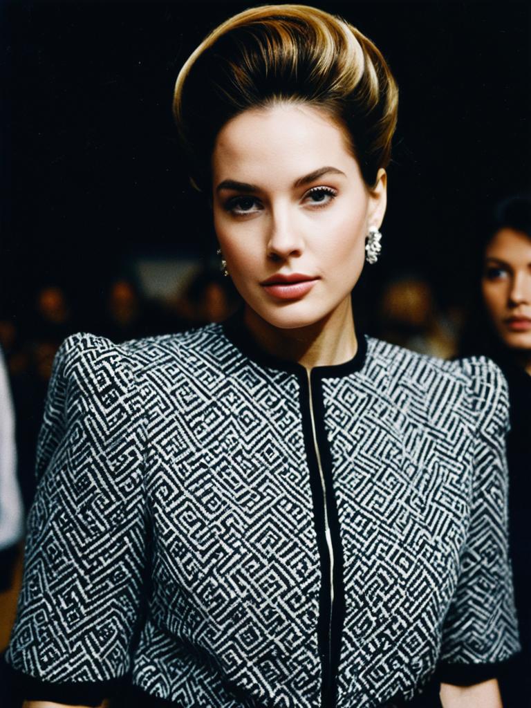 A woman poses confidently in a chic designer outfit featuring a geometric black and white pattern, embodying sophisticated fashion festival style. Her elegant hairstyle and statement earrings complement the refined look, set against a softly blurred background highlighting the fashion-forward essence of the scene.