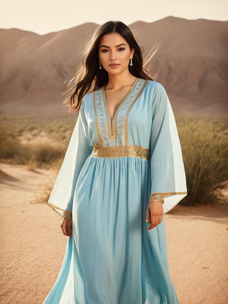 A woman stands outdoors in a desert landscape wearing a photorealistic Arabian-style dress in soft blue with intricate gold embroidery. The flowing garment complements the natural tones of the desert and mountains in the background, creating an elegant and serene portrait.