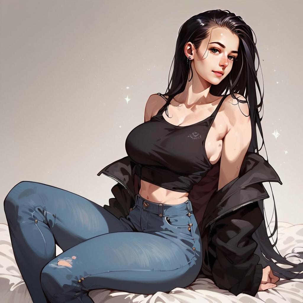 This digital anime-style illustration features a confident young woman with long black hair, sitting casually on a bed. She is dressed in a black crop top and high-waisted blue jeans, with a black jacket draped over her shoulders, showcasing a modern and stylish look. The artwork highlights smooth shading and delicate facial details characteristic of contemporary anime art.