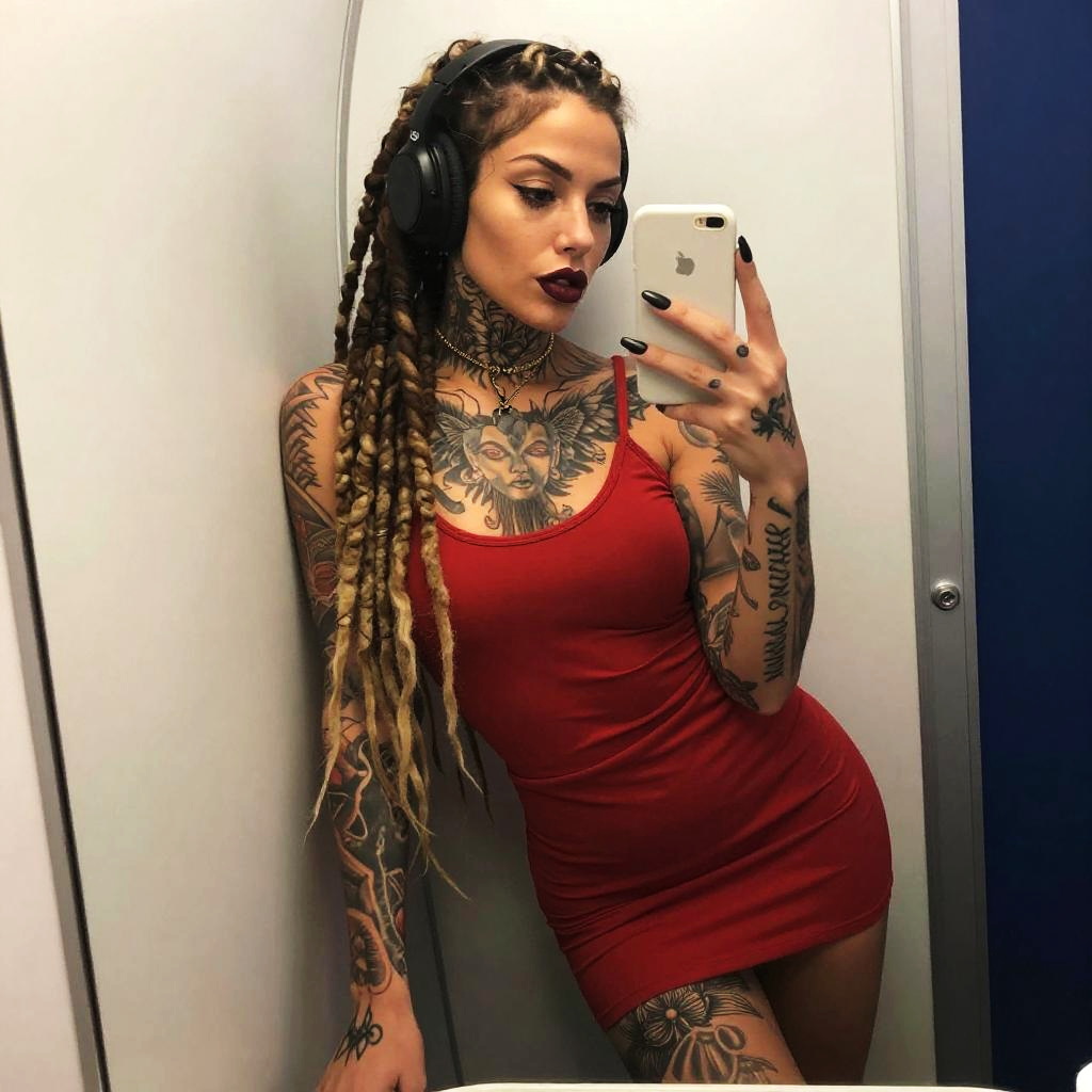 A confident young woman with dreadlocks and extensive tattoos takes a mirror selfie wearing a fitted red tank dress and black headphones. Her bold makeup and edgy style highlight a modern alternative fashion look in an indoor, minimalistic setting.