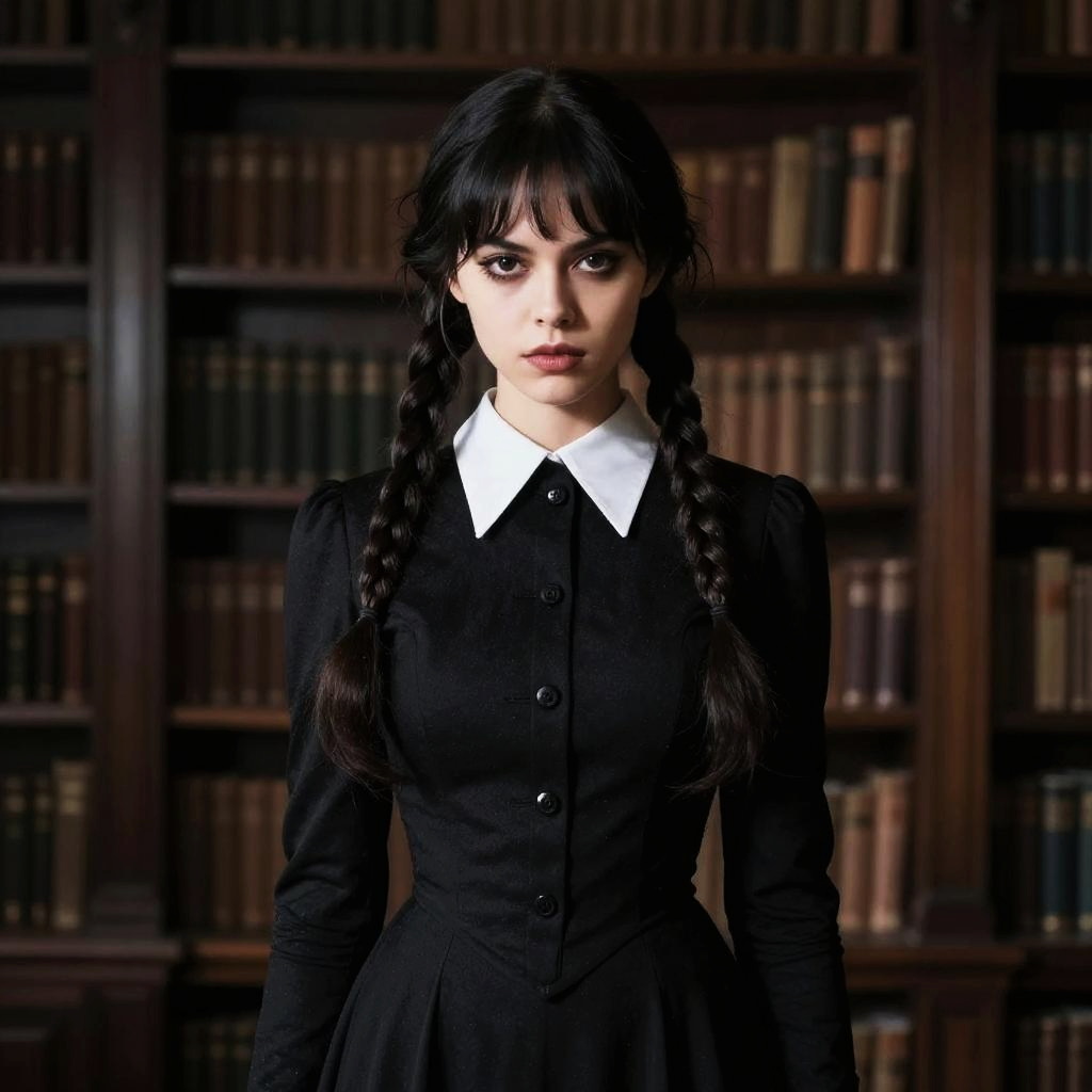A young woman with braided hair stands in front of a bookshelf filled with leather-bound books, evoking a vintage or gothic academic atmosphere. She wears a black dress with a sharp white collar, reminiscent of the iconic Wednesday Addams style from the Addams Family series.
