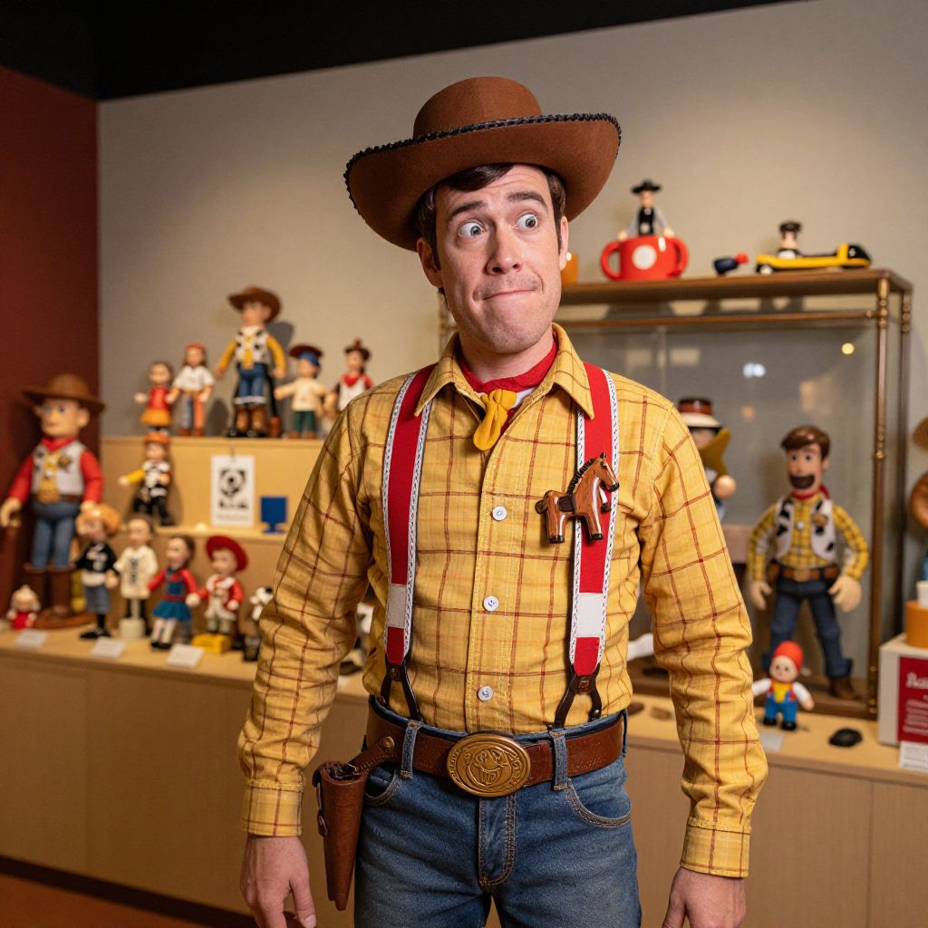 Man Dressed as Woody from Toy Story with Collection of Woody Dolls