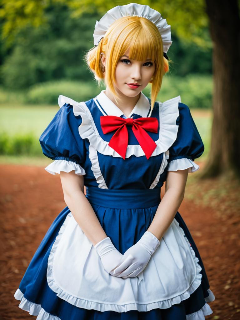 A woman dressed in a classic maid outfit with a navy blue dress, white frilled apron, and a large red bow poses outdoors against a blurred natural background. Her hairstyle and costume evoke a cosplay style inspired by anime or manga, capturing a polished, realistic portrayal of the character Mugetsu from the Touhou series.