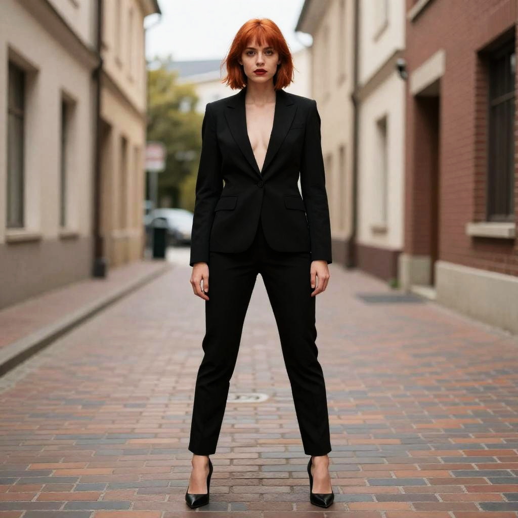 A confident woman with short red hair stands poised on a brick walkway between buildings, wearing a sharp black suit with a deep neckline and black high heels. The urban setting and her edgy style convey a modern, powerful fashion statement.