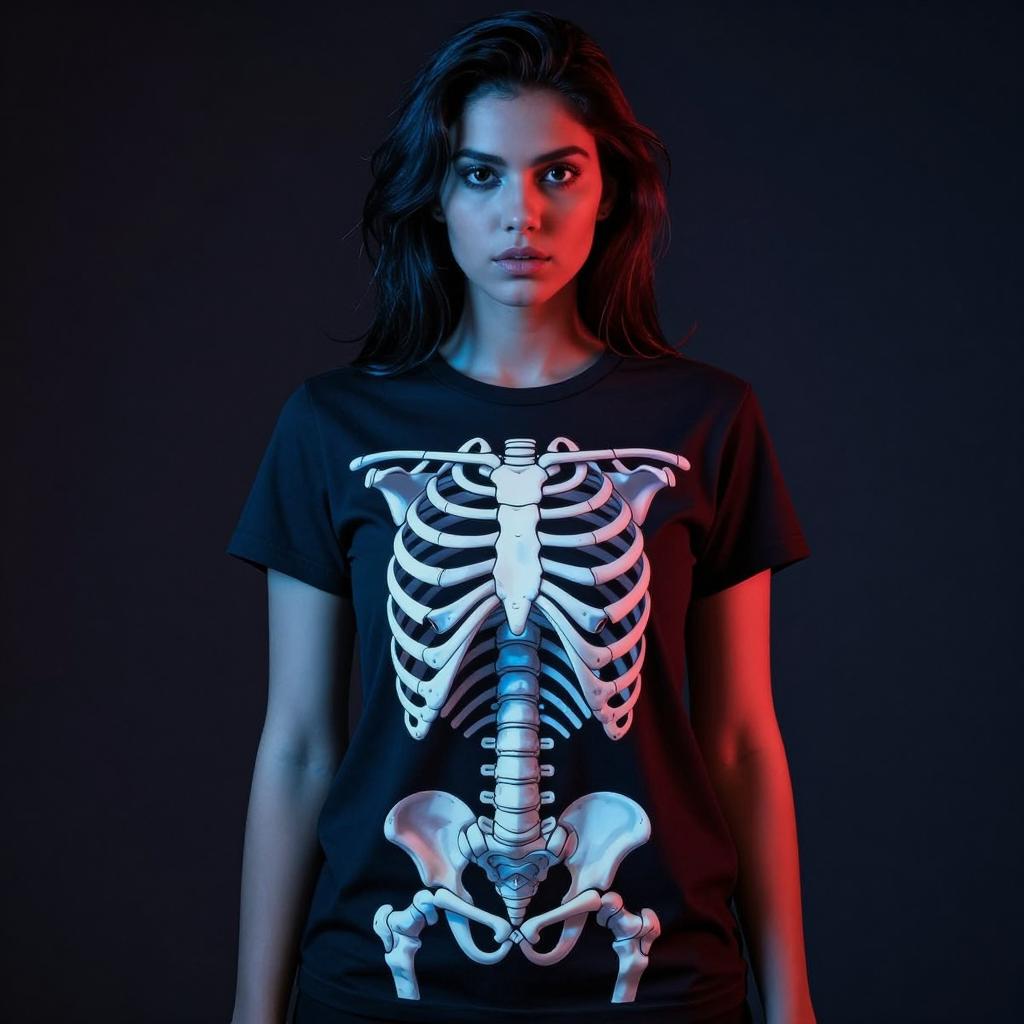 A young woman stands confidently wearing a black t-shirt printed with a detailed human skeleton design, set against a dark background with dramatic blue and red lighting. The photo has a modern, edgy feel that resonates with Gen Z fashion and style trends, emphasizing bold visual contrast and anatomical motifs.