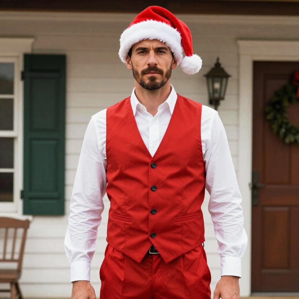 A man is dressed in a redneck Christmas costume featuring a red Santa hat, a matching red vest, and red pants, paired with a crisp white shirt. He stands confidently in front of a house with a green shuttered window and holiday decorations, embodying a festive yet rustic holiday style.