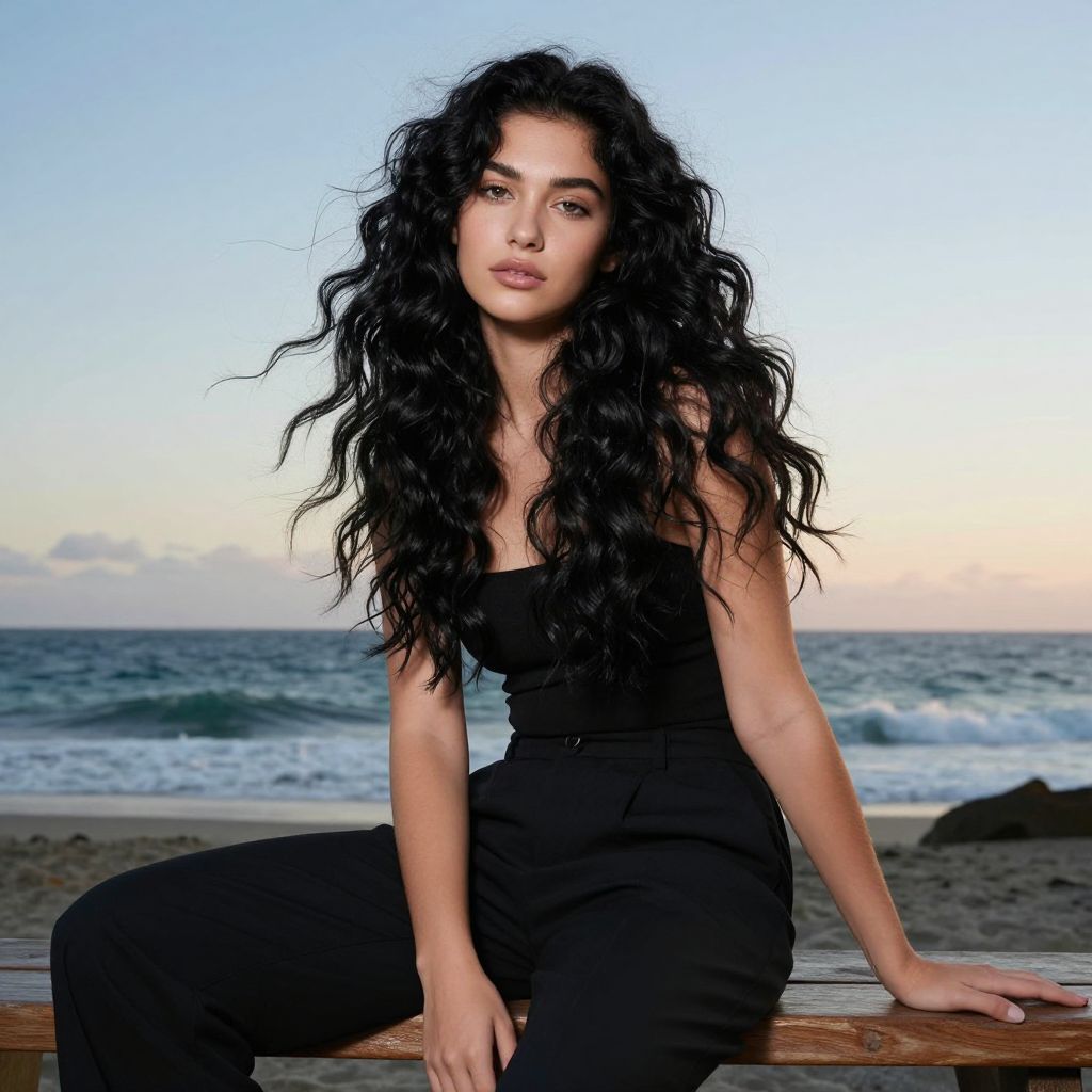 A woman with long, voluminous curly black hair sits on a bench at the beach during sunset. Her relaxed yet poised posture against the backdrop of the ocean and soft sky creates a serene and elegant portrait.