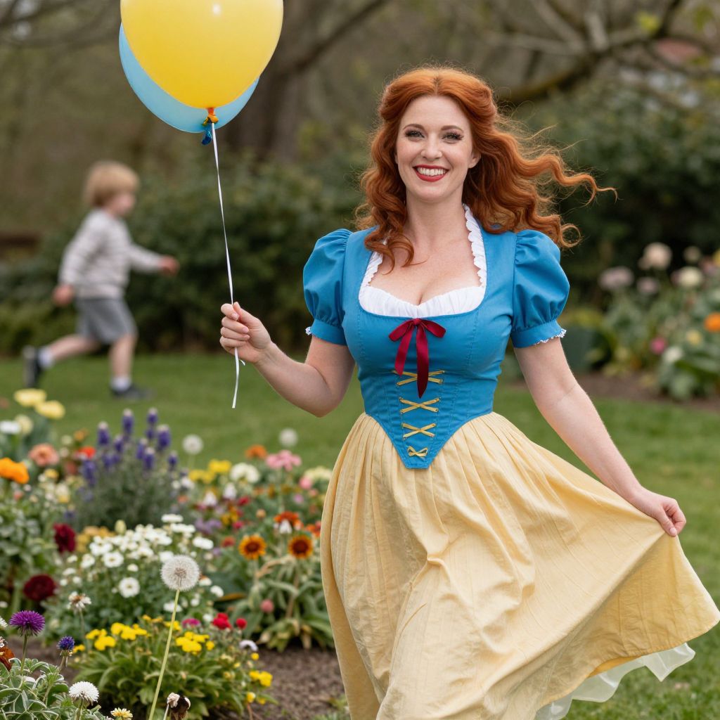 A cheerful red-haired woman dressed in a vibrant blue and yellow costume, reminiscent of a storybook princess, joyfully holds two balloons while standing in a colorful garden full of blooming flowers. The lively atmosphere is enhanced by a blurred child playing in the background, adding a sense of whimsy and fun.