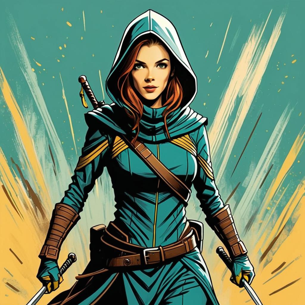 Digital Illustration of Woman Warrior in Hooded Outfit with Swords