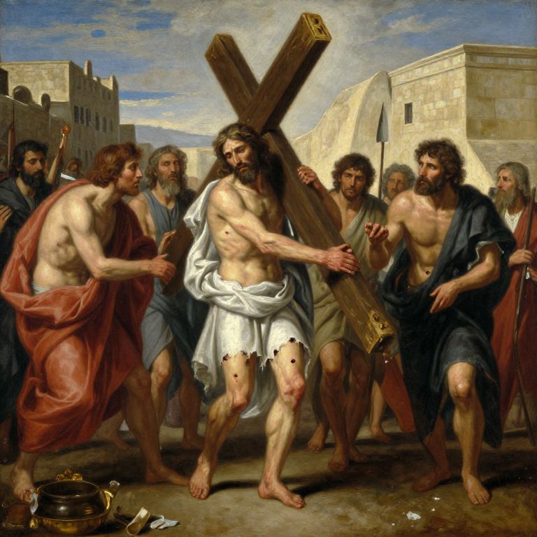 This classical oil painting depicts Jesus Christ carrying the cross, surrounded by a group of men assisting and observing him. The scene is set against an ancient city backdrop, characterized by detailed, realistic figures and dramatic use of light and shadow, typical of Baroque religious art.