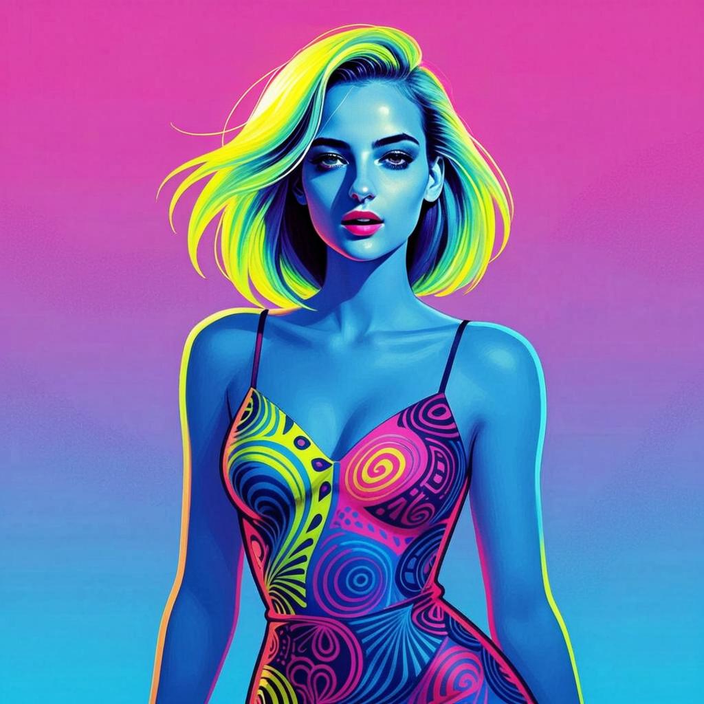 Neon Pop Art Woman with Psychedelic Dress and Blue Skin