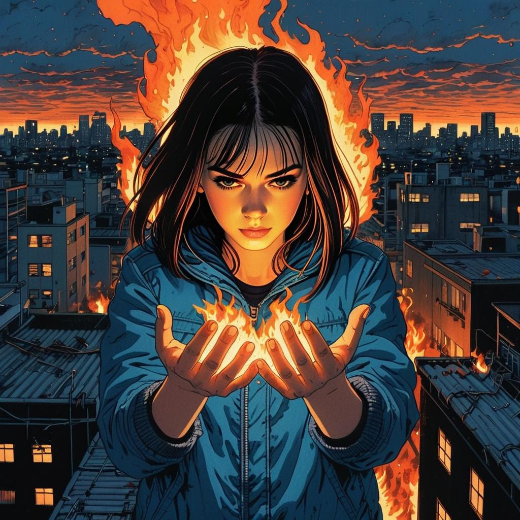 A striking digital illustration of a determined young woman in a blue jacket, standing atop a cityscape at dusk with flames engulfing her hands and rising behind her. The dramatic lighting and dynamic flames contrast with the detailed urban background, capturing a powerful and intense atmosphere in a comic or graphic novel style.
