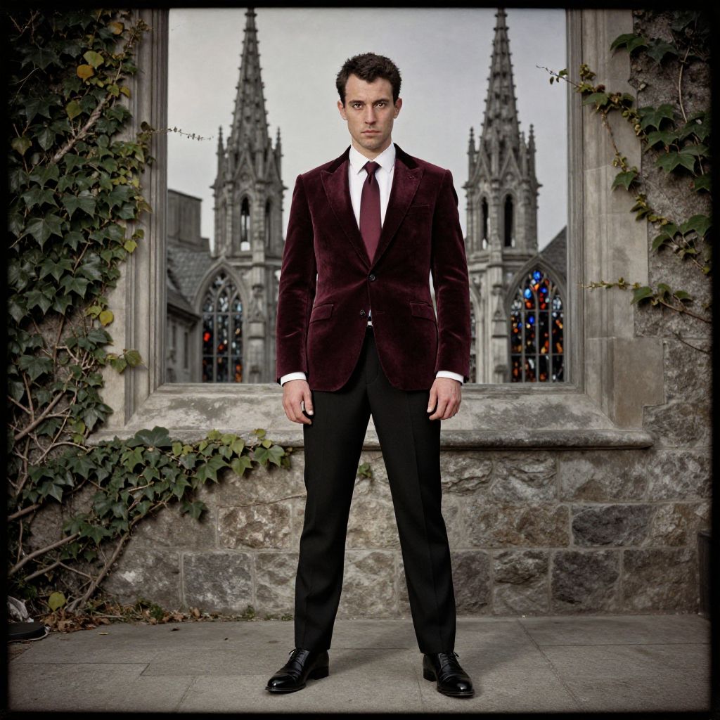 Man in Burgundy Velvet Blazer Standing by Gothic Cathedral Window