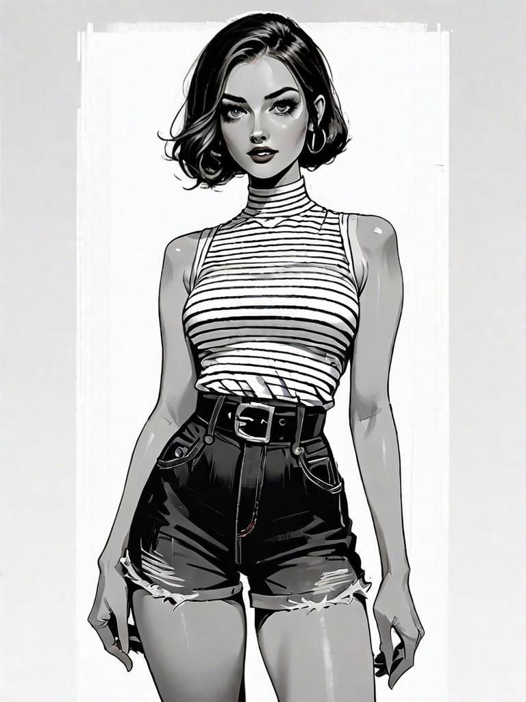 This striking full-body digital illustration features a confident woman in a realistic comic art style, wearing a sleeveless striped turtleneck and high-waisted distressed shorts with a belt. The monochrome palette and detailed shading emphasize her strong pose and stylish appearance, blending modern fashion with classic comic aesthetics.